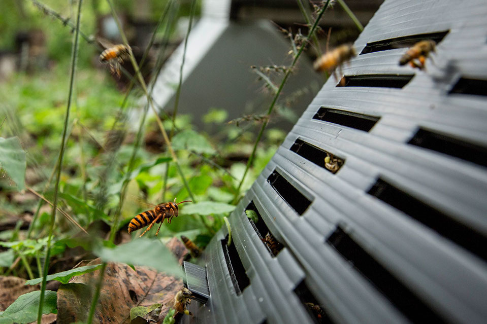 黒井蜂場「中年の門番」の前でスズメバチが蜜蜂を待ち伏せする