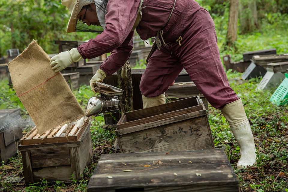 五十嵐さんは養蜂の仕事を始めて「7年目ですかね」と、もう充分な経験を積んでいる。「養蜂は面白いです。自分が考えているように、蜂はならないので、試行錯誤の繰り返しですけど……。自然の中で仕事をできるのは魅力だなと思っています。嫁(三女・恵さん)と同じ物流の仕事をしていたんですけど、結婚して養蜂の仕事を始めた頃は、正直、蜂の羽音に慣れなくて、気になって振り払いたくなるんですよ。羽音に慣れるまでは少し大変でしたけど、慣れてしまった今では、やり甲斐のある仕事だと思っていますね」
