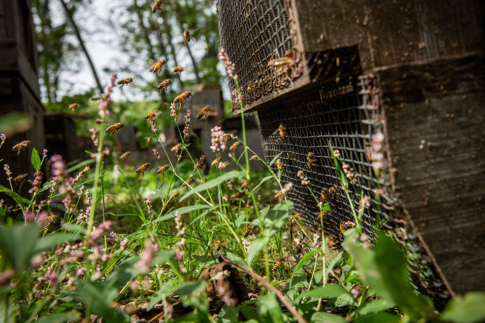 黒井蜂場を太陽が照らすと蜜蜂が活発に動き始める