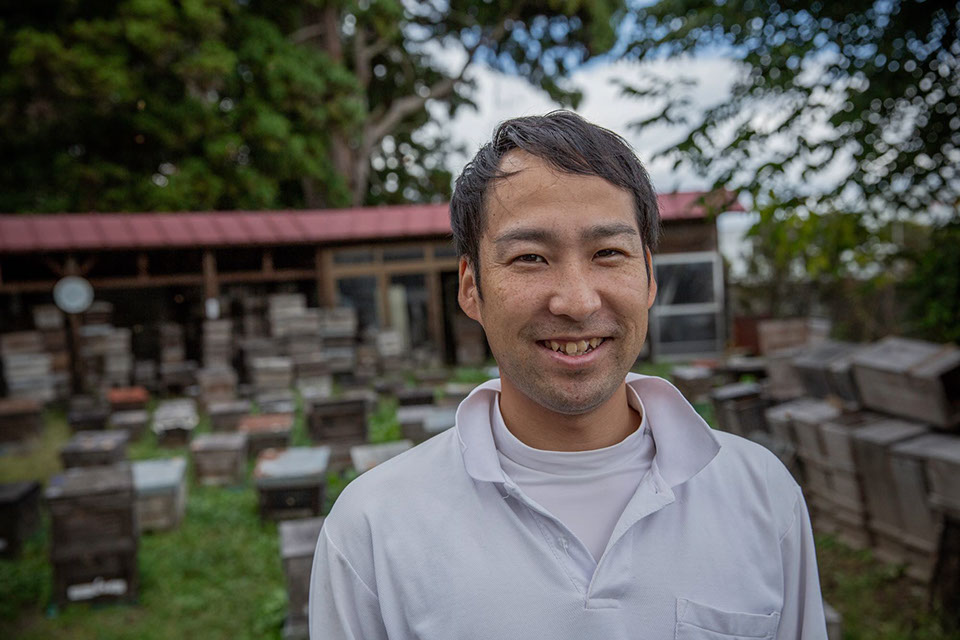 「祖母ちゃん(房子さん)が(養蜂を)やっていたんで、子どもの頃から馴染みがありましたけど、本格的にやり始めてからは、まだ10年くらいかな。初代の頃の巣箱が今も倉庫に残っていますよ。今は使ってはいませんが、当時は、あの箱が600個ぐらいあったといいますから。今年、東北圏内は(蜜の採れ具合が)あまり良くなかったですね。蜜源も減っていますから。仕事としては、やっぱ山に行って自然の中で仕事できるのは、自分に合っています。秋には、トトロが住んでいるような真っ赤になった山に入って行くんでワクワクします。20歳代は工場勤めも僕、していたんですけど、朝出勤して夕方退社すると、もう夜じゃないですか。外も見えない工場の中で、工場の光の中だけに居る生活は、やっぱ一年くらいしか続かなかったですね。25歳くらいまでは海外へ行ったりして、オーストラリアの農家で働いていました。バナナを採っていたんですけど、ほんと泥だらけでやって、8か月くらいはそこで働いてみて、こっち(養蜂)の方が自分に合っているんだなと思ったです。採蜜の時には、ほんと、山の緑色がきれいで、すごいんですよ。それも一か月間くらいですけどね。最近は、(蜜が)これは入ったなという程の採蜜はやってないんでね。来年こそはって思っています。結婚してから嫁が養蜂をですか……、いや、やらないと思います。虫は嫌いと言っていたから」