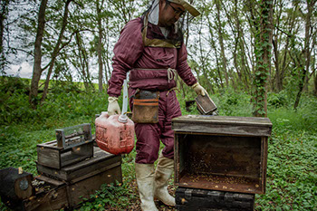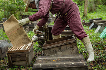 「蜂を巣箱の外に払うと、次の日蜂場に来てみると、気温が急に下がって動けなくなった蜂を見ることがありますからね」と、残った蜜蜂が移動しやすいための心憎い優しさだ。