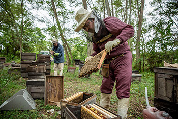 何なんだよと思いましたね。9時間というのも辛かったです。走っても走っても着かない。横になりたいという一心でしたね。こういう世界があるのかと思いましたよ。25年くらい前の話ですね。でも、最初は養蜂が意外と楽しかったですよ。ギスギスした人間関係はないし、自然の中での仕事ですし……。しかし、規模を大きくしていかなければならないと……、のんびりやっていれば良いという時期が過ぎると、やっぱり苦労も出てきますよね。一人ではできない、蜂を置く場所をどうする、トラックを大きくしなければならない等々、次々と課題が出てきますからね。蜂との相性は特に抵抗なく出来ましたけど、蜜蜂のことは分かんないから、本を読んで調べたりしましたね。だいたい蜜蜂は眠らないですからね。これはすごいですよね。産卵枠は35℃を保たないといけないとか、組織化された社会性や、太陽を中心として距離を測る力や匂いを感じる力とか、蜜蜂ってすごいですよね」