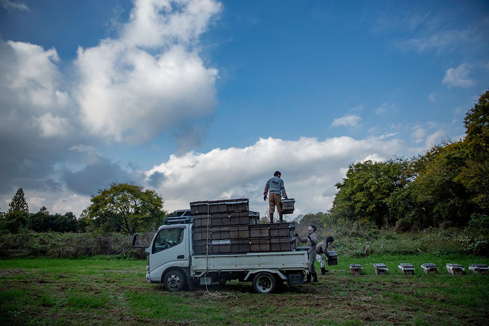 トラックの荷台から熊谷市の蜂場に巣箱を降ろす野々山さん