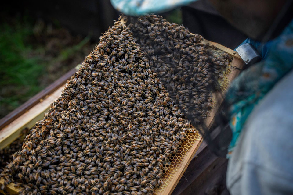 「始めた頃は何も分かんないから、夜でも仕事しなくっちゃと思って、夜中、巣枠を持って仕事をしていたら、疲れて、そのまま眠ってしまったことがあったね。気が付いたら頭の周りを蜂がブンブン飛んでいたよ」。皆が大笑いだ。
