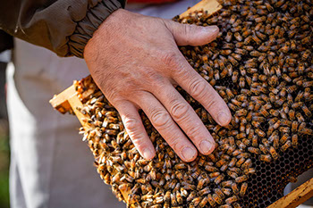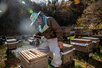 巣板に集る蜜蜂群に掌をそっと当て「ほら、暖かいですよ」と野々山さん