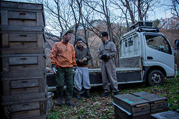 翌朝、野々山さんが案内してくれたのは岩手県下閉伊(しもへい)郡山田町にあるトーマネ蜂場。野々山さんの蜂場を目にするのは初めてだ。三方を小高い山に囲まれた小盆地の地形で、周辺にはカラマツやケヤキの大木が黄色く色付いている。裏返したコンテナに巣箱一つ一つを載せて整然と並ぶ蜂場は、野々山さんの几帳面な性格が現れているのだろう。燻煙器を準備して面布を被り、熊避け電柵の電源を切って中に入った。巣箱群の中央辺りで一つの巣箱の蓋を開け、野々山さんが私を呼ぶ。