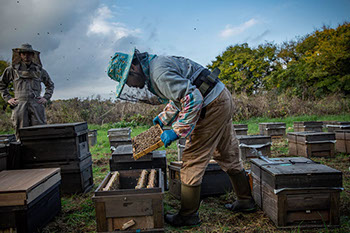 イチゴ交配用の群を作るために巣板に集る蜂の状態を見る野々山さん