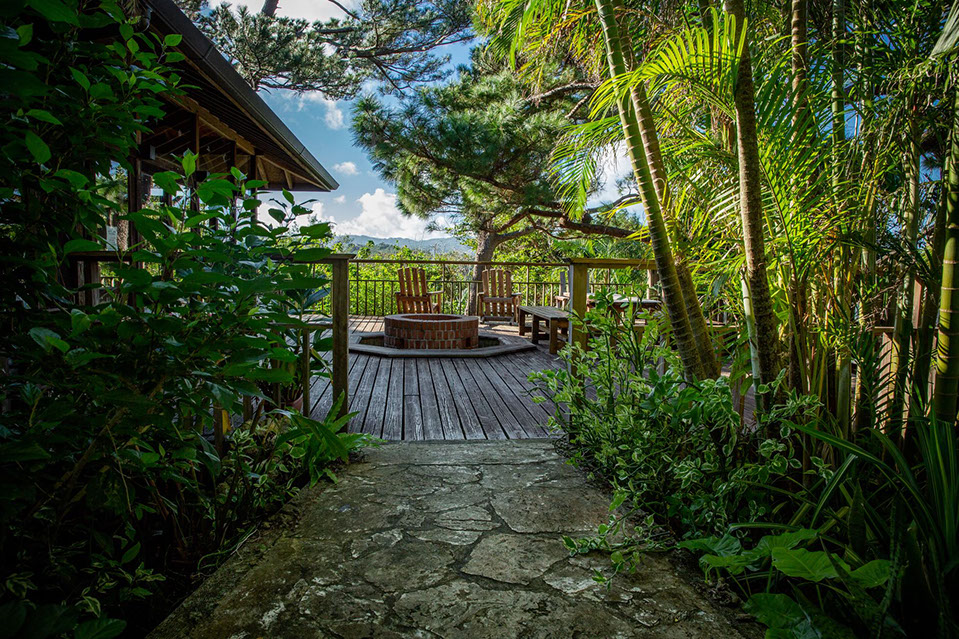 亜熱帯植物が茂るニライナリゾートのエントランスを抜けて木造デッキに入ると、キャンプファイヤーができるレンガ炉が中央に造ってある。リゾートの客たちは、ここで星空を見上げて島の夜を楽しむのだろう。