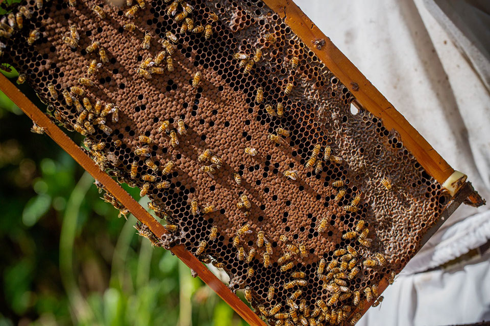単箱の巣板にはびっしりと蜜蜂がたかる