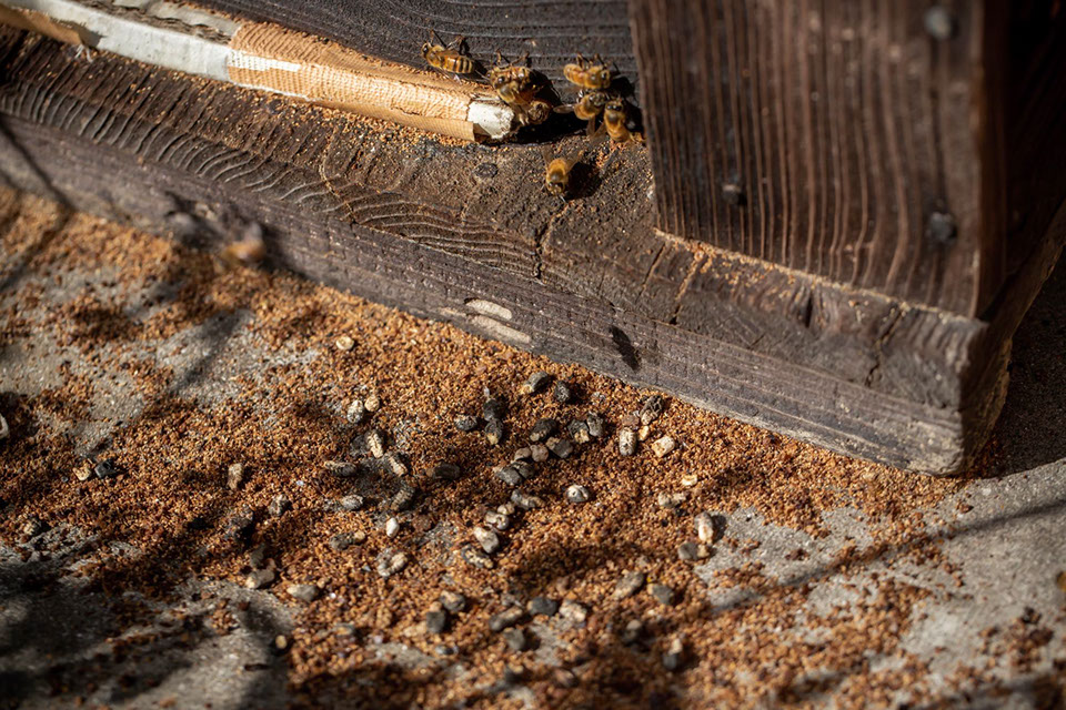朝食を済ませると仕事開始だ。地元で委託販売をしてもらっている物産市場に瓶詰めの蜂蜜を追加納品した後、自宅に戻った藤岡さんは燻煙器や道具袋などを取り出して蜂場へ行く準備を始めた。道具と一緒に黒糖飴の袋を取り出して「チョーク病が治る、これ」と言う。倉庫の入り口に4、5箱並べてある巣箱の前に、チョーク病の被害となった幼虫の白い死骸が転がっている。「オーストラリアからの輸入の蜂なんやけど、チョーク病に弱いね。飴を食わせて抑えよったら、採蜜もできる。白い蛆よ、あれがチョーク病よ」。私にそう説明するが、特に困っている風ではなく、内検に行く準備が整うとすぐに蜂場へ出発した。