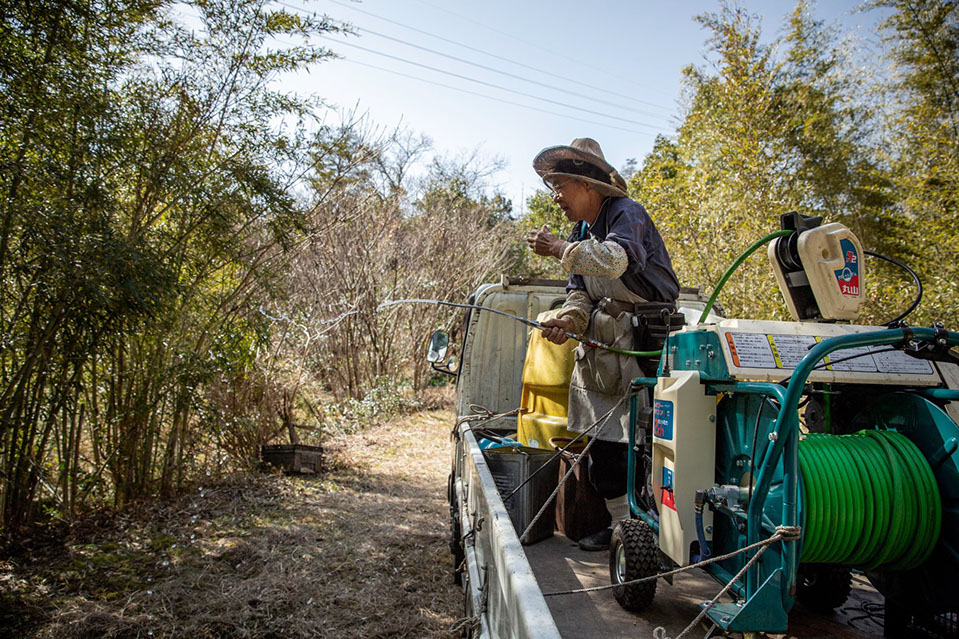 藤岡さんには通い慣れた集落内の細い急坂を2tトラックでも難なく上りきった。動噴のエンジンを掛けてタンクの砂糖水をトラック横の茂みに向けて噴射しながら、時折、藤岡さんが砂糖水に指を当てて舐めている。前回給餌をした後で洗浄した際の真水がホース内に残っているため砂糖水の濃度を確かめているのだ。