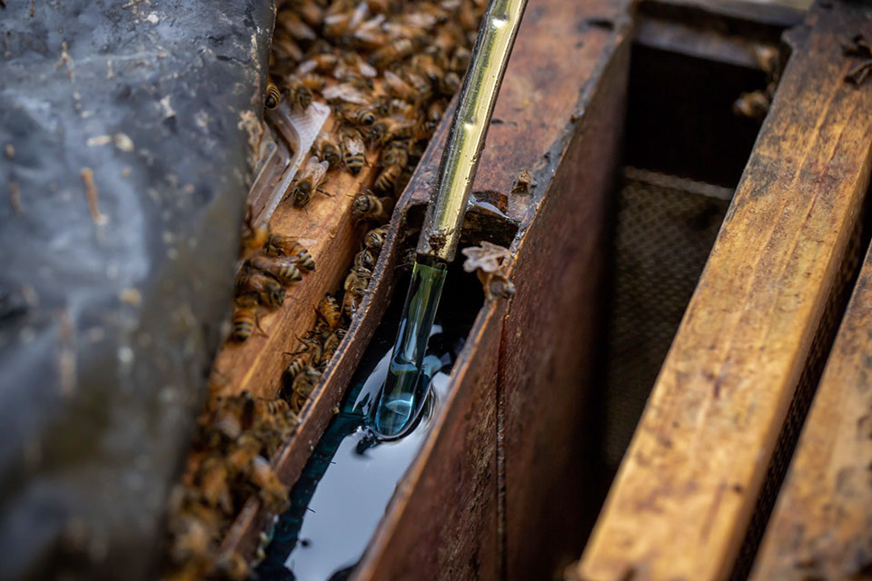 準備が整うと蜂場の一番奥の巣箱から給餌を始めた。防寒のために蓋の下に入れてあるビニールシートを少しだけ捲って、給餌箱の縁ギリギリまで砂糖水を注入していく