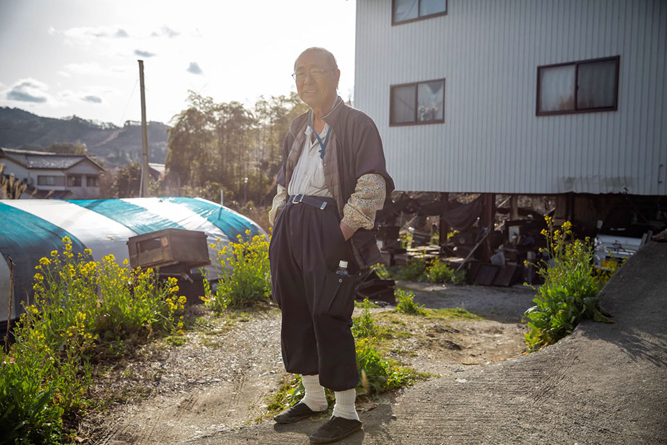 「越冬のために横浪半島に巣箱を持ってくる蜂屋もいるけど、ぼくら蜜も採るけどね。もう何年も前、正月3日やったかな。様子を見に来たら狸に蓋を開けられとったことがあったね。燻煙器も道具も持ってなかったから、近くの知り合いの蜂屋に燻煙器を貸してくれや言うて調べてみたら、蓋の下に入れてあるビニールが爪で引っかいてあったね。猪は悪いことはせんね。その年に限って集落上の蜂場でも開けられたね。冬の冷やい時はヒヨドリが蜂を捕りに来とることがあるのよ。巣門の前をトントンと嘴で叩いたら、蜂が怒って出てくるわい。それを食べよるんよ。蓋の上の糞を調べてみたら中は蜂ばっかりよ。今朝は冷やいけんかな、蜂は動いとらんね。ヒサカキでも咲いたら飛び始めるかも知れん。ここで6升、7升が3回きれいに採れるけんね」