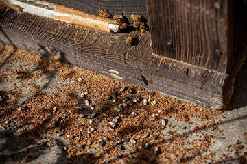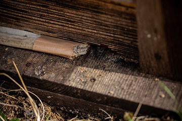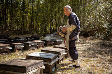 蜂場は、藤岡さんの暮らす集落の中を縫うように巡る急な坂道を軽ワゴン車でズンズン上り、民家がなくなった辺りの竹林に囲まれた所にあった。丸く固めた新聞紙を燻煙器の燃料にして火を着けると、蜂場の一番奥から内検を始めた。蜂場の半分は周りの竹林が朝日を遮って日陰になっている。巣門は折り畳んだ新聞紙で塞いであり、4分の1ほどが空いている。