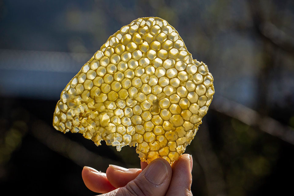 ムダ巣を光にかざすと、蜂が体を使って寸法を測った六角構造がきれいに見える