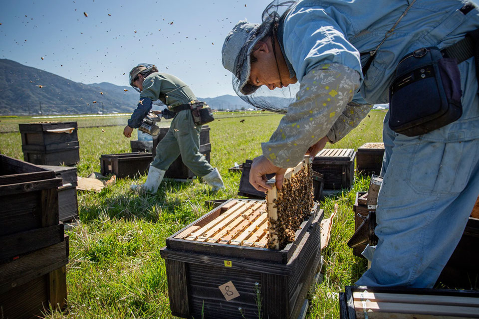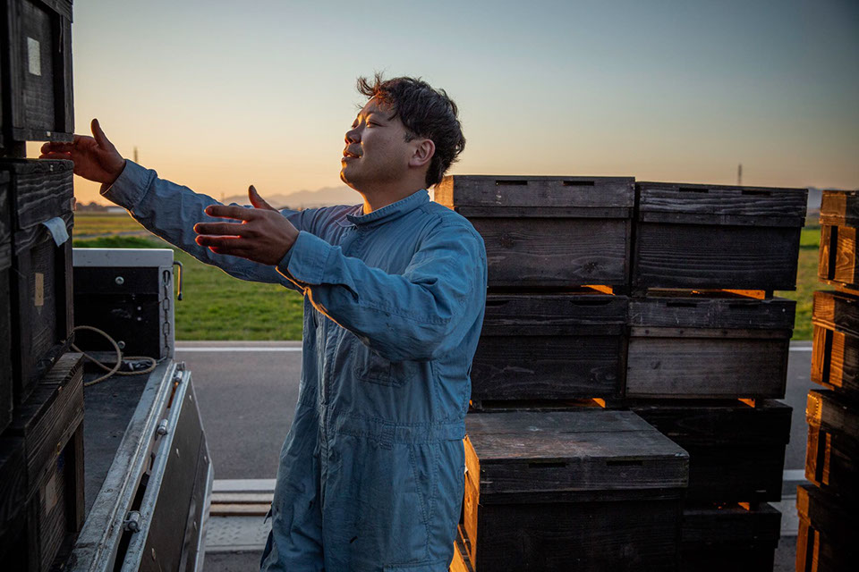 翌日は、間もなく始まるレンゲ蜜の採蜜準備として、越冬して蜂児が増え始めた群の単箱の入れ替えと蜂数を増やすために継ぎ箱を載せていく作業だ。約束の午前8時前に事務所に伺うと、千年さんがCoffeeを淹れて待っていてくれた。午前5時から仕事をしていたのだと言う。「作業時間前にちょっと案内しましょう」と誘ってくれたのは、マルハナバチの飼育室。ミツバチボーヤと名付けた段ボウルの飼育箱に巣板の数で1000匹、2000匹、3000匹と分け、女王蜂が居なくても1、2か月間は受粉できるようにフェロモンを使って育てている。