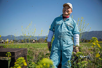採蜜準備を終えていた菜の花畑に近い蜂場で千年さんが内検をする