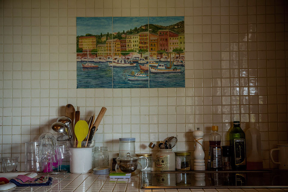イタリアの雰囲気がある自宅台所。タイル絵のある壁は、イタリアで買ったタイルを洋典さんが自分で貼った