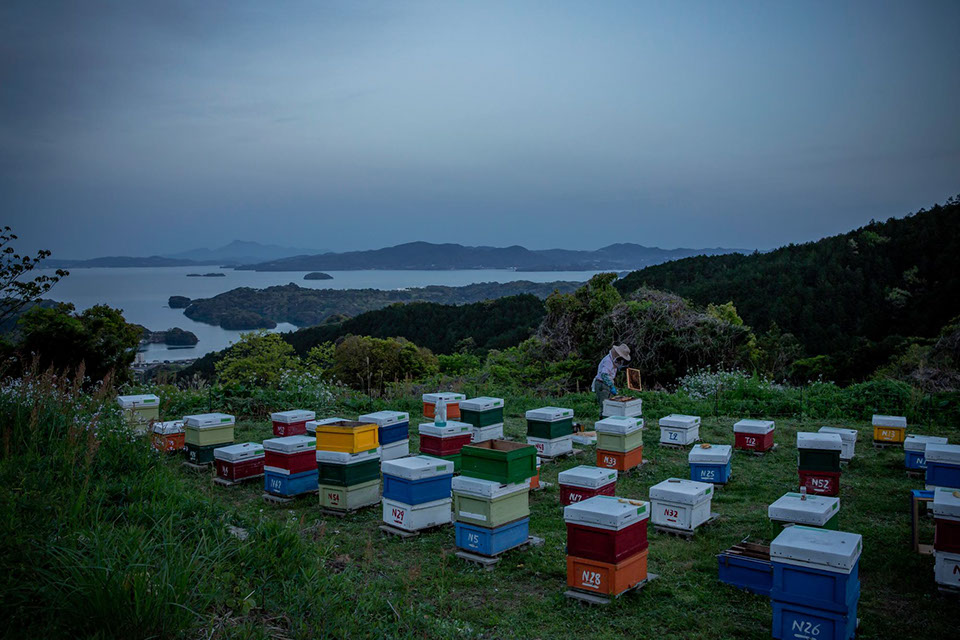 夕陽が山の端に沈み辺りが薄暗くなるまで内検を続けていた洋典さんが「ごめん、ごめん」と声に出して、急いで継ぎ箱の蓋を閉めている。「今の(蜂群)は怒り狂っていましたね。寒いし暗いし……」と、洋典さん。この日の内検は終了したが、明日、移動させる予定の継ぎ箱の巣門を閉じなければならない。巣門の前に小さな木片を釘で打ち付け、閉じる作業が終わったのは午後7時を過ぎていた。