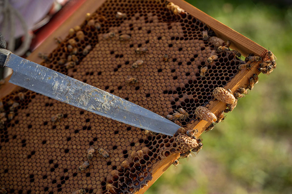 洋典さんは巣板の隅々まで丹念に見て、王台を見付けては包丁で切り落としていく。