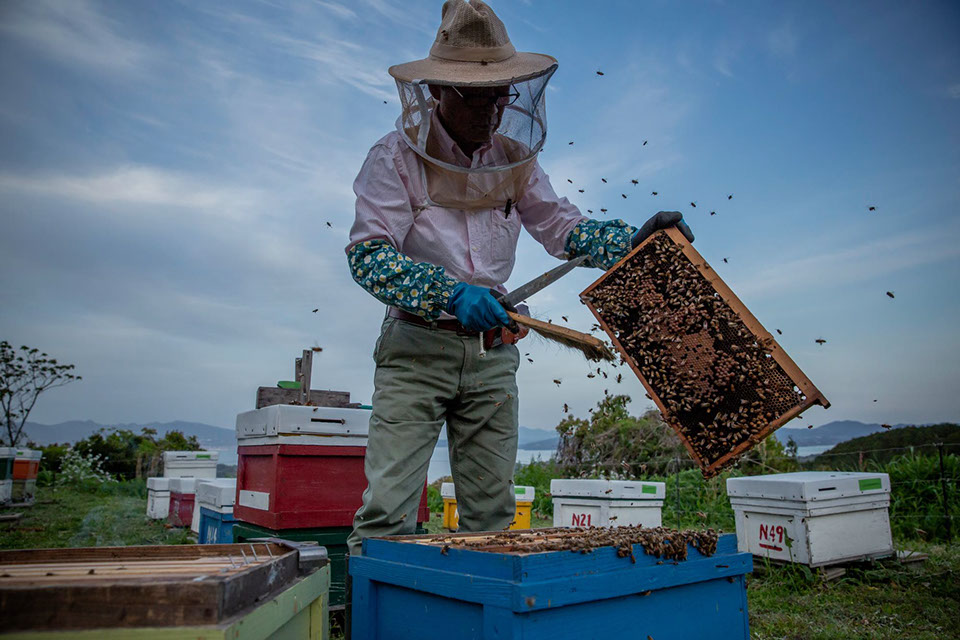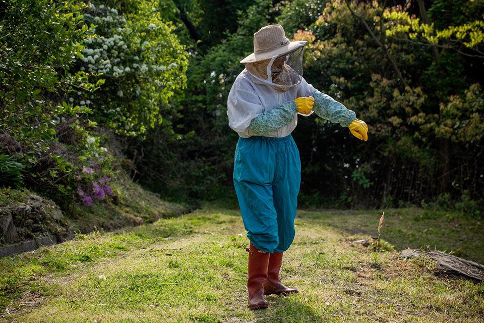 翌日は晴天の朝を迎えた。ポコトスカーナ駐車場上のクスノキにツリーハウスが作られている。現在のところ有効に使われている様子はないが、洋典さんと由香さんが思い描いた暮らしのイメージが形になったのだろう。ウグイスのさえずりが近くの雑木林から聞こえる。養蜂用具を置いてあるホワイトハウスと呼ぶ白く大きなパイプハウスの前で由香さんが青いズボンに白い上着、レンガ色の長靴を履いて面布を着け、準備万端の様子だ。