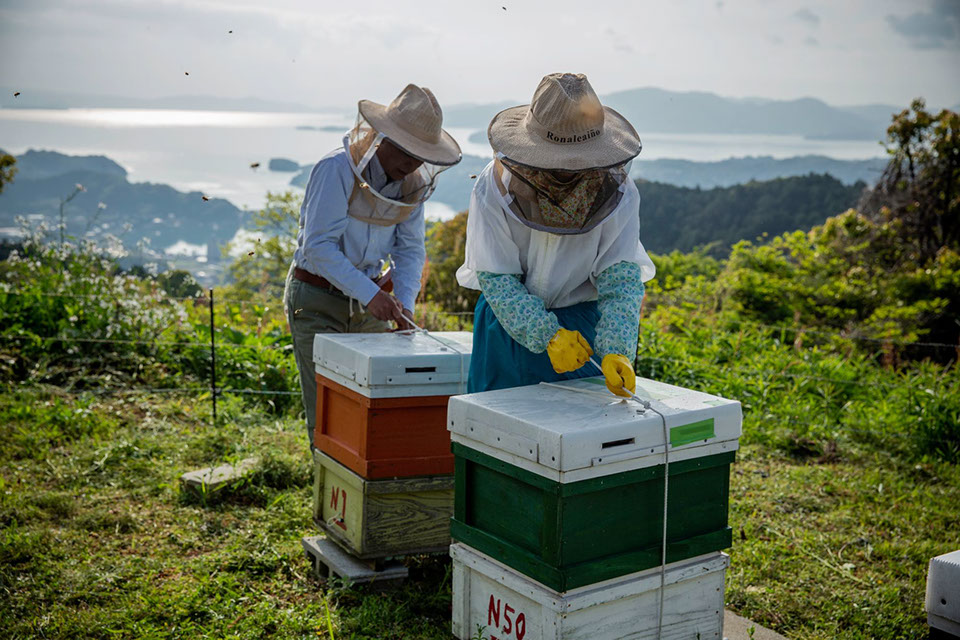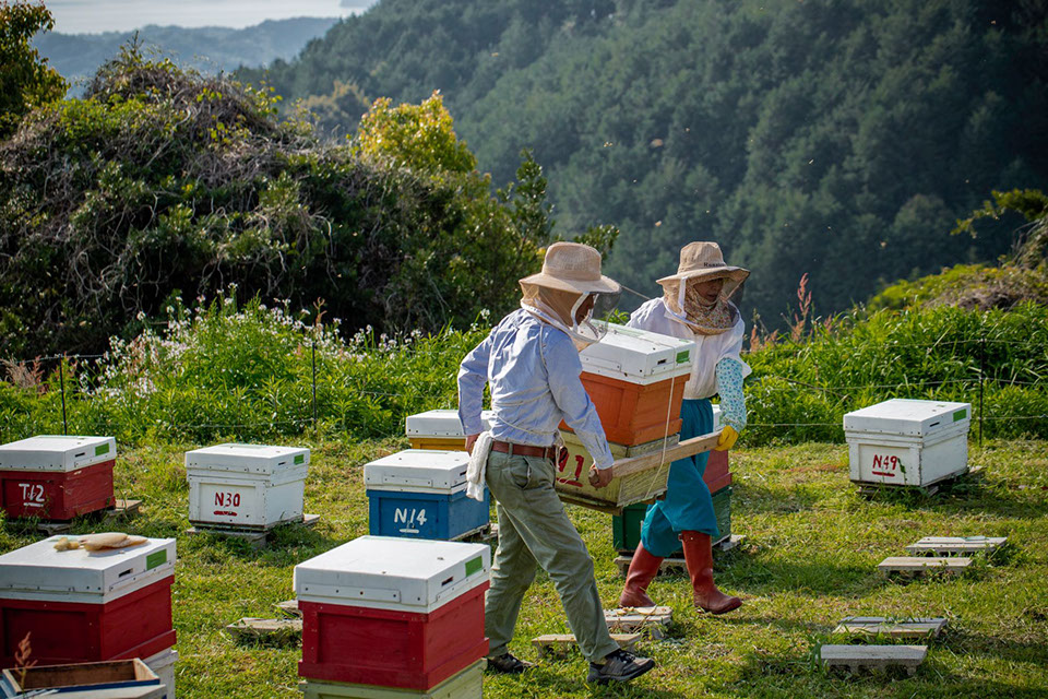 洋典さんの軽トラックは、国道206号を形上湾に沿って少し北上した地点から西の山側へ坂道を上る。舗装された坂道をしばらく上った所で、左に折れ未舗装の林道へ入ると間もなく楠原蜂場に到着した。普段は使っていないようでブロックの土台は並べてあるが、巣箱は見当たらない。洋典さんが鍬を使ってブロックを整え終えると、ここでも神輿を運ぶように角棒で継ぎ箱を挟み込んで運び並べていく。継ぎ箱をブロックの上に並べ、巣門を開け終えるまでにおよそ30分。「はい、これで作業は終わりました」と、洋典さんが宣言するように声に出すと、巣箱を縛っていたロープを外して束ねていた由香さんが、巣箱に目線を送り「頑張ってね、君たち」と戯けたように声に出す。これで楠原蜂場の採蜜準備は整った。5月半ばからは百花蜜の採蜜が始まる。