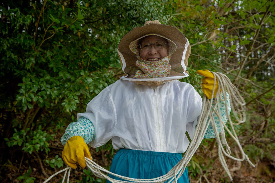 巣箱を設置終えると由香さんがロープを取ってまとめる
