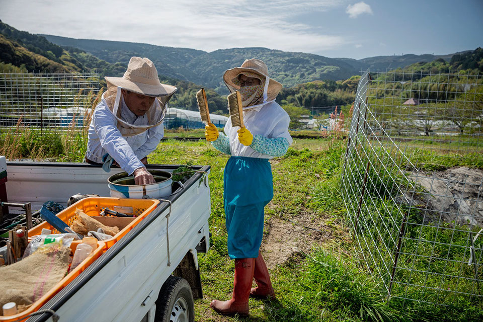 田んぼの中の蜂場で内検が続く。由香さんが燻煙器で援護する