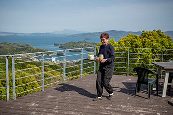 初夏の清々しい風がハチミツ農園ポコトスカーナのデッキを吹き抜けていく。眼下に碧々と広がる大村湾、その手前には尾戸半島に囲まれた形上湾の海面が僅かに見え、近くには手崎地区の小さな湾に沿って民家が連なっている。古くから目の前の海で日々の糧を得てきた暮らしを彷彿とさせる集落の佇まいだ。