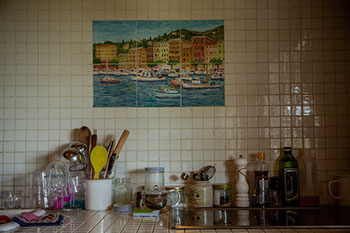 イタリアの雰囲気がある自宅台所。タイル絵のある壁は、イタリアで買ったタイルを洋典さんが自分で貼った