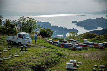 「5年ほど前からダニ駆除が上手くいくようになって、それから早めに継ぎ箱を上げられるようになったんです。ダニを制することができて、冬に入る前にメチャメチャ(蜜を)溜め始めているので、蜂が元気に越冬できるようになりましたね。それで2月10日から100ccずつチマチマと餌をやって、春が来たよと知らせ、3月10日頃になると、後は蜂が自分たちで蜜を採ってくるんです。昔の僕のやり方は、生活保護してやらないとだめだったけど、今の方法だと(蜂が)自立してやれているから給餌は要らないんです。今のように色々なやり方を試したりできるのは、ダニを制してからですね。それまでは(蜂を)生かすことが精一杯でしたね。毎日のように3箱、5箱と潰れた巣箱を持って帰って、掃除する気力もないというか……。ようやく目指した景色が見えてきたなと思って、それで今年は、まず桜蜜を採ろうと、早めに継ぎ箱を上げたんです。例えは飛躍し過ぎかも知れませんけど、釣れた鯛を2匹3匹持ってきてくれるよりは、雑魚でも良いから釣り方を教えてくれたことに感謝しているんです。最初に2群の蜜蜂を貰って、巣箱の作り方も教えてもらって、後は、自分で大きくしていけましたからね」
