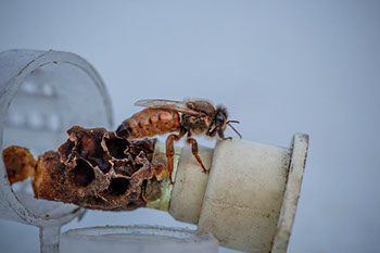 後日の報告では、2日間そのまま置いてから確認すると、王籠の新王は働き蜂から餌をもらって生きていたので、「受け入れられたと思って、群の中に放しました」ということだった。偶然だったが、1件落着ということだ。