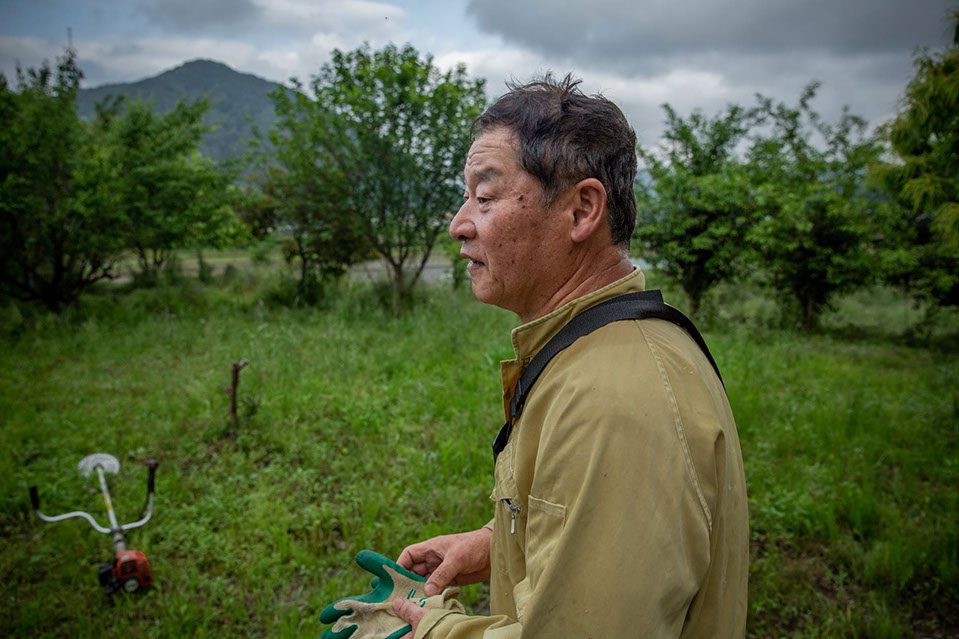 宿南蜂場の草刈りを終えてホッとした表情を見せる健一さん
