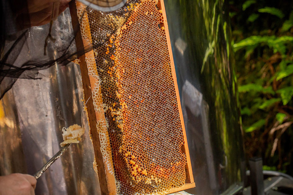 「豊岡でトチ(蜜)を採って百花(蜜)も採って、それから北海道へ行ってもキハダ(蜜)に間に合うんです。その後にアザミ(蜜)、アザミの後でシナ(蜜)が入るんです。若干重なる時もありますけどね。盆過ぎて8月末くらいからはソバ(蜜)も入ってきますしね。補助金で一人の人が150ヘクタール(ソバを)作るようになって、5、6人やっています。5年ほど前からみると大違いですね。無理してでも採ってしまわないと、ほとんど蜜巣になってしまったら女王蜂が卵を産む巣房がなくなりますから。汗かいただけ収入になりますから。一番大量の時には一日に(一斗缶で)30本、100万(円)くらいになりますからね。盆過ぎたら蜂屋は、もう終わりという気分になるんです。それが、そこからソバ(蜜)が入ってきますんで、体にむち打たんとですね。ソバ(蜜)があることで助かっていますからね。イチゴ農家への貸出用に作った蜂に餌をやらなくても良いのは助かりますね。気温が下がってくると蜜が固くなって、遠心分離機から(蜜が)出ませんしね。今は(遠心分離機が)韓国製なので出るようになりましたけどね。機械は重いけど、蜜は良く出ますね。回転が良いんでね。蜂払い器も韓国製ですもんね」