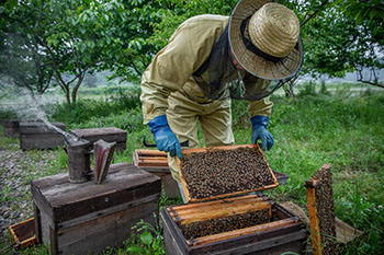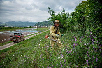 健一さんは金属刃を取り換えたばかりの草刈り機を肩に掛け、「(蜂蜜の成分検査の時に)農薬(の成分)が出たらアウトですからね」と、宿南蜂場の周りに巡らせた電柵の周辺の草刈りを始めた。電柵の近くには紫ヘアリーベッチの花が咲いている。電柵に草花が触れると漏電するため、定期的な草刈りは必須だ。1時間ほどで草刈りを終え、休む間もなく巣箱の蓋を開けて、蜂児枠を別の巣箱に移動させている。