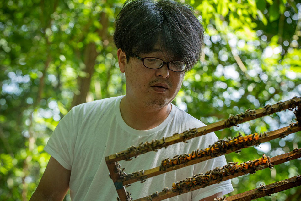 「高卒で派遣技術者として車メーカーで設計をやっていたんですよ。リーマンショックで会社の事情があって早期退職者を募集していた時でした。一生この仕事をやれるかと自問してみると、無理だなと思ったのがありますね。職場でのストレスがありました。その点、この仕事は体のきつさはあるけど、まだ性に合っているかなと思って……。高校卒業するまではまったく興味がなかったです。けど、会社を辞める1年くらい前から週一で手伝いはしていたので、それでやれるのかなという感じがありましたね。養蜂を始めても親父の方がずっと主導だったので……、ここ2、3年じゃないですかね、親父が身を引いているのは……。私が移虫で蜂を作れるようになったのもあるのかなと思っていますけど……。もう14年になりますね。早えぇなあ……」