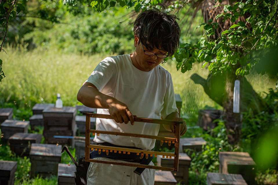 店舗裏の蜂場で裕一さんが無王群に付ける王台を選ぶ