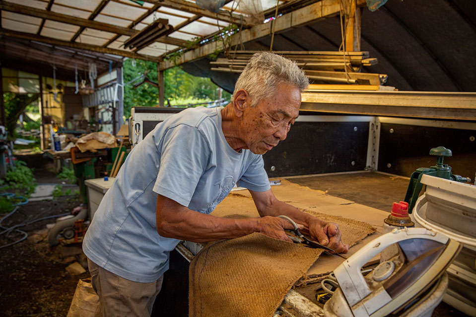 蜂を分けて王台を付ける裕一さんの作業が終わる頃、正さんは店舗横の作業場でドンゴロス(麻袋)を切り揃えていた。近年は、巣枠の上に被せるドンゴロスが入手できない状態が続いているという。仕入れてきたドンゴロスを巣箱の大きさに切り揃えてアイロンを掛けている。明日はローヤルゼリー採集と移虫作業の予定だ。正さんとまゆみさんも、明日は蜂場へ行って一緒に作業することになっている。この日の仕事を終えた裕一さんがやってきて、ローヤルゼリーの効果が話題となる。