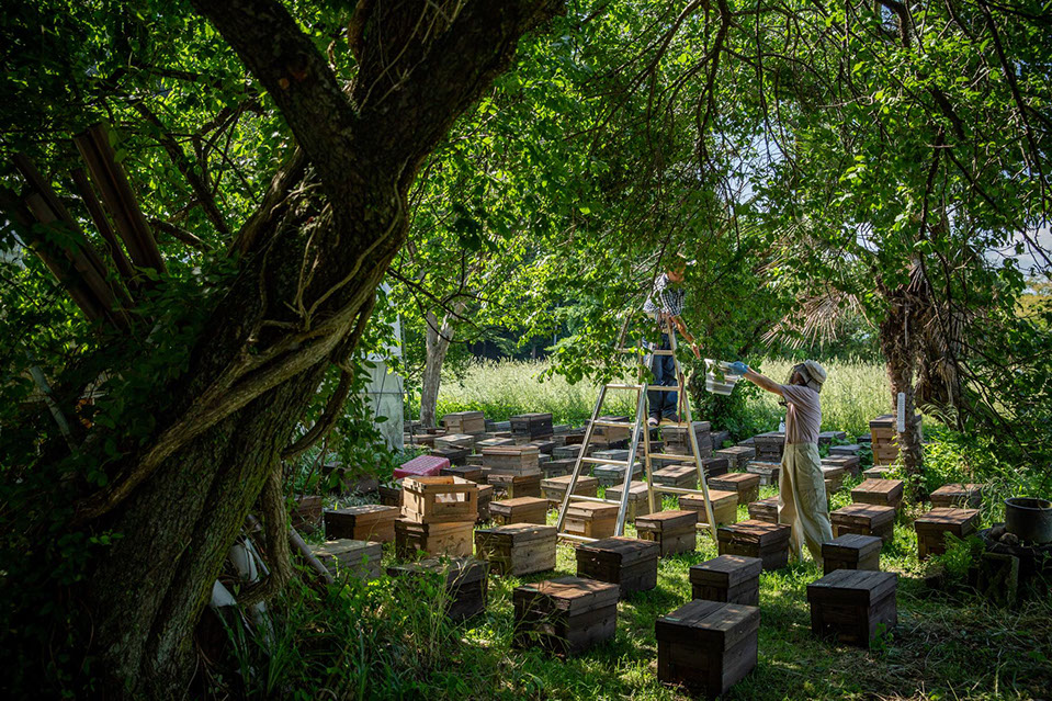 店舗裏の蜂場で梅の実を採る珠美さんと藤田さん