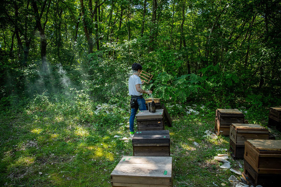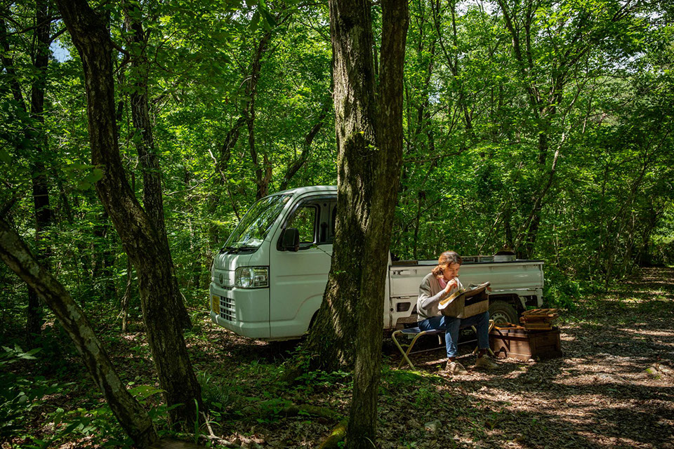 移虫してから48時間の幼虫を、まゆみさんがローヤルゼリーの中から取り出すと、正さんが真空ポンプで王椀の中のローヤルゼリーを吸い採っていく。王椀の中のローヤルゼリーを吸い採ると一連の作業は終わるが、すぐに続いて、次のサイクルのために移虫が始まるのだ。それまでは3人が向かい合って作業をしていたが、移虫は集中力が要るのか、それぞれが木陰だが木漏れ日が注ぐような明るい場所に移動して黙々と移虫が始まった。裕一さんも巣箱の横に陣取って移虫に集中している。移虫が終わった王台枠を巣箱に収めて給餌を行うと、翌々日には再び、移虫後48時間の幼虫を抜き取りローヤルゼリーの採集を行う。1日置きのローヤルゼリー採集は休むことができない。精神的にも大きな負担のある仕事なのだ。