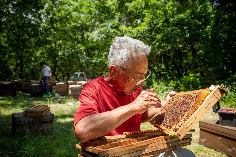 そこに裕一さんの弟子だという藤田嘉秀(ふじた よしひで)さん(75)も手伝いに参加してきた。元はスーパーマーケットの店長を長くしていて、その店に玉生美蜂場の蜂蜜を納品していたのが縁で藤田さんも養蜂を始めたのだ。「63歳まで私も移虫はできましたよ。目が良くないと駄目だよ。年には勝てないという奴だね」。藤田さんに呼応するように、まゆみさんが誰に訴えるともなく話し始めた。「正直、ゼリー採りはやりたくないです。目が見えないですもん。目が見えないだけはどうしようもないです。勝てないです」。まゆみさんは21歳の時に正さんと結婚した。「こういう仕事をするのは知らないで嫁いできたからね。何も思わないで来てしまったから……。お客さんとお話することで蜂蜜の反応を知って、お客さんに喜んでもらえているのが分かると、又、やろうかなと思いますね」