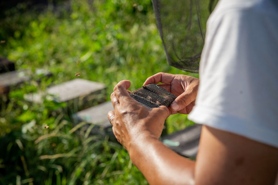 「カーメーカーに技術職で勤めているんですけどね。テレビで養蜂の番組を見ていて、なんか楽しそうだなと思って、それに元々生き物が好きなんで……。実家でカメ、ウサギ、熱帯魚、ヤドカリ、ハムスター、カエルとかも飼ったことがありましたね。去年の9月から週一回のペースで通わせてもらっています。予想以上に楽しいですよ。良いとこ引いたな、ラッキーだったなと思っています。蜂は可愛いし、蜂と触れ合っているのが楽しいですね」