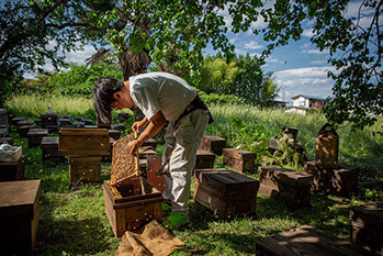 移虫を終えて店舗に戻ると、母親のまゆみさん(60)が広場の奥で巣箱に防腐剤のクレオトップを塗っている。正さんは横の広場で雨合羽を着て巣箱の洗浄を続けていた。妹の珠美(たまみ)さん(37)は店舗で接客と配達を担当しているというから、家族全員で営む玉生美蜂場だ。