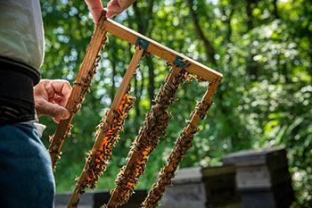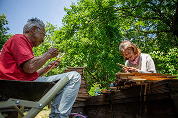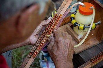 巣箱の列から少し離れた広場で、正さんとまゆみさんが向かい合って椅子に座り、裕一さんが巣箱から抜いた王台の付いた棒を前に積み上げて作業を始めている。まゆみさんがローヤルゼリーの溜まっている王椀の中から移虫して48時間の幼虫をピンセットで取り出している。正さんは次の移虫作業の準備として、ローヤルゼリーの溜まっていない王台を小さなヘラで掃除している。