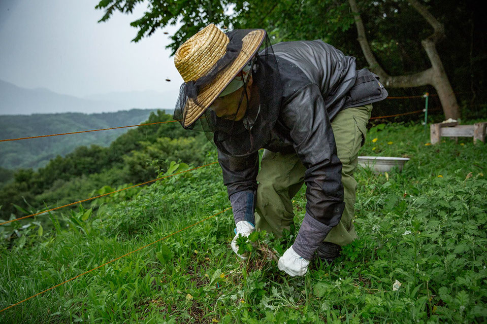 内検を終えると電柵下の草をむしり取る