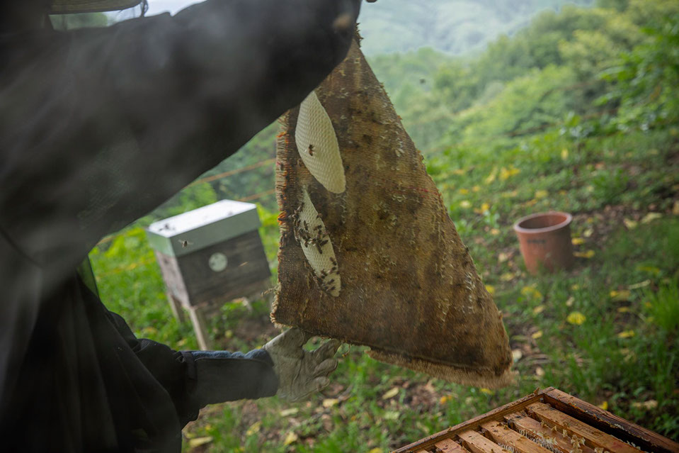 「ワーッ、すごい。蜜入った」と豪さんが声に出す。巣枠の上に掛けてある麻布をめくるとムダ巣が付いている。豪さんは、蜜巣板の表面をピンセットで引っかいて蜜蓋を崩し、蜂が蜜を食べられるようにしてやっている。「ケンポナシの蜜が入ったかな、売るほどは採れないんで……、でも、ほんとはすごく美味しいです」。次の採蜜までの餌としてケンポナシの蜜を蜜蜂に与えているのだ。「次に狙っている花があって……、ボダイジュです。今年、咲きそうなんで待っているんです。去年はラベルまで作って待っていたんですけど、咲かなくて……」と、いかにも待ち焦がれているように豪さんが話す。