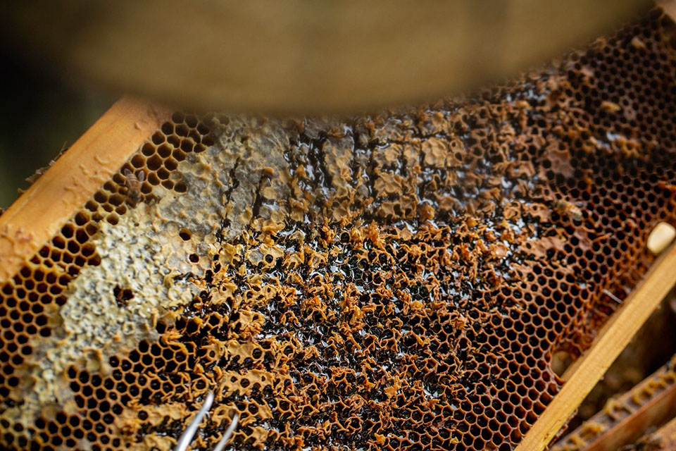 蜜巣板の蜜蓋をピンセットで剥ぎ取り当面の餌として蜂に与える