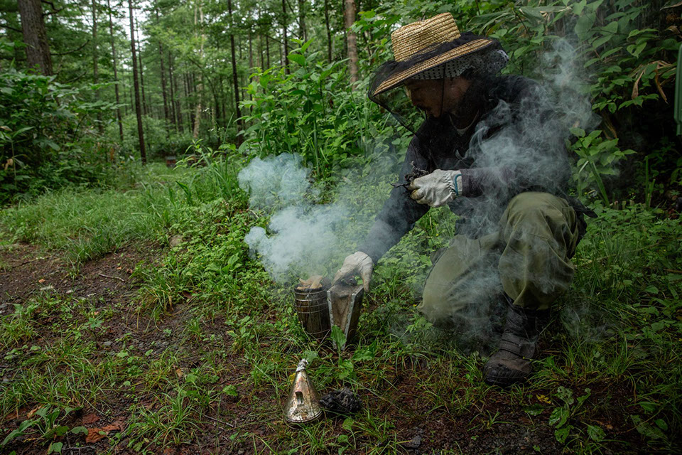 戸隠蜂場のある国有林には、トチやウワミズザクラ、ボダイジュ、キハダ、イタヤカエデなどの広大な自然林が広がっている。その一部にカラマツの人工林があり、その一角を切り拓いた広場が豪さん自慢のトチ蜜を採る戸隠蜂場だ。「毎回、ここに来る時は熊にやられていないかドキドキしながら来て、巣箱が倒れていなければ良かったって感じですよ。遠くからでもガサガサとかバサッと音がしたら、熊ですから。ここら辺は熊だらけですから」。燻煙器を準備しながら豪さんが教えてくれる。