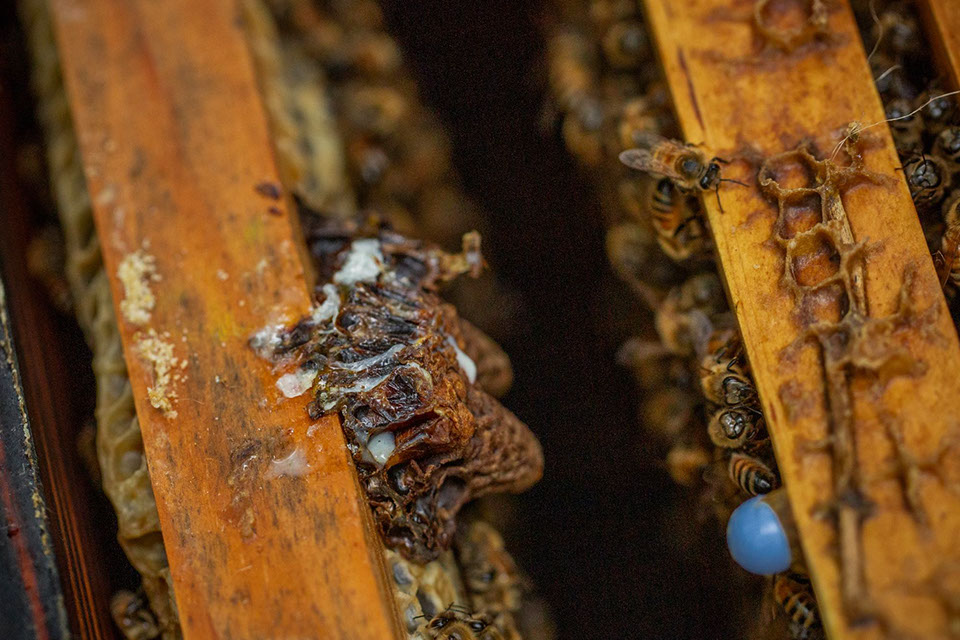 電柵の電源を切ると、手前の巣箱から内検を始めた。1枚1枚巣板を引き上げて王台ができているかどうかを確認する。続いて雄蜂の巣房の蓋をピンセットで壊し、幼虫を引っ張り出してダニの有無を確認する。