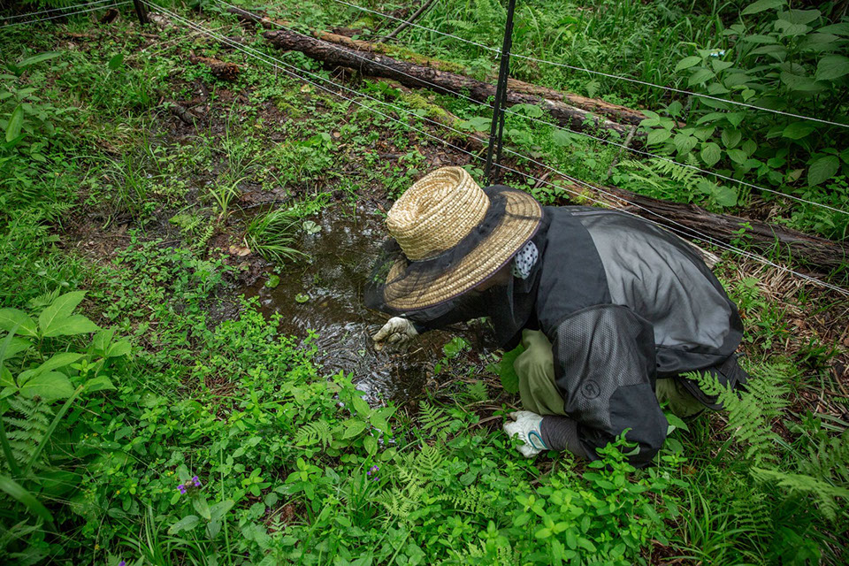 内検を終えて電柵下の草をむしり取っていくと、蜂場奥の電柵下に窪みができて雨水が溜まっていた。蜜蜂の水飲み場になっているようで、数匹の蜜蜂が水面に浮かんでいる。
